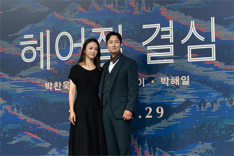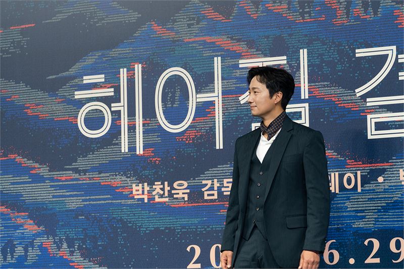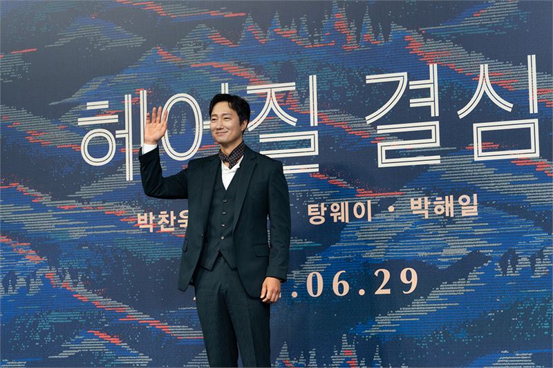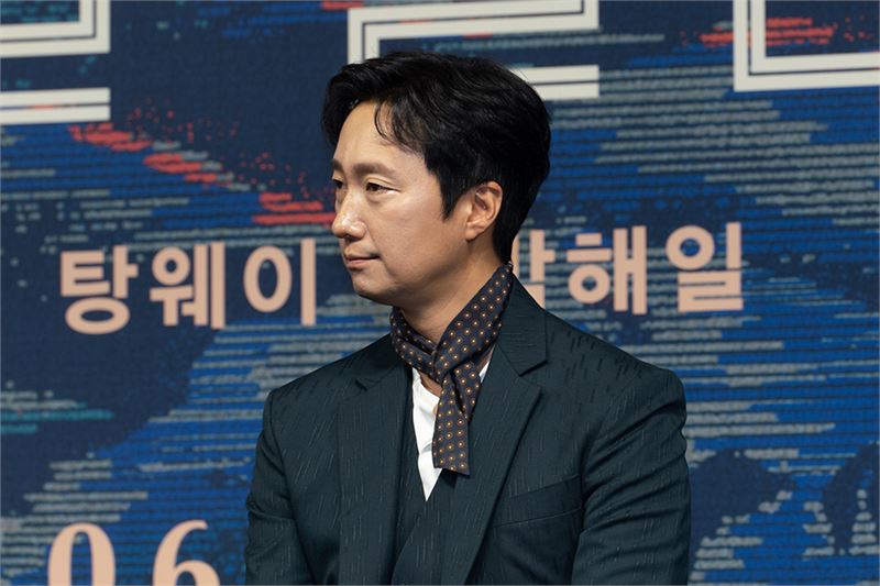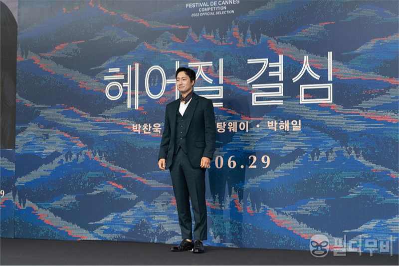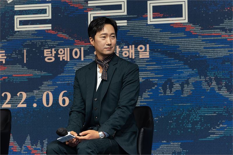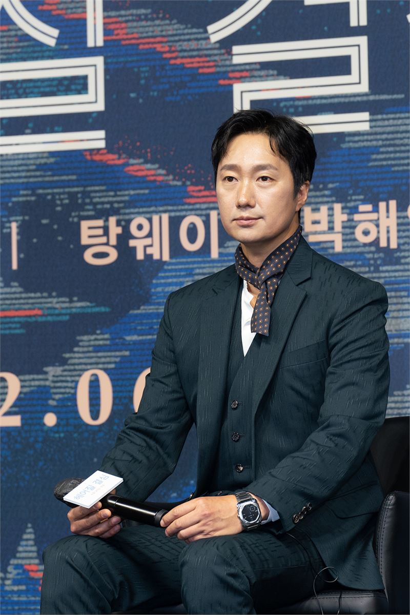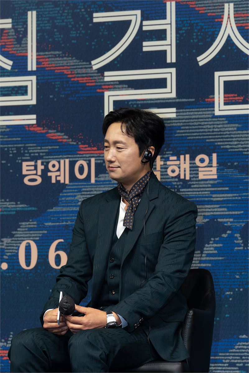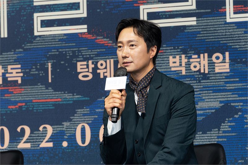 영화 <헤어질 결심>에서 특유의 위트가 섞인 깊이 있는 연기를 펼쳐 화제가 되었던 박해일의 제작보고회 모습.