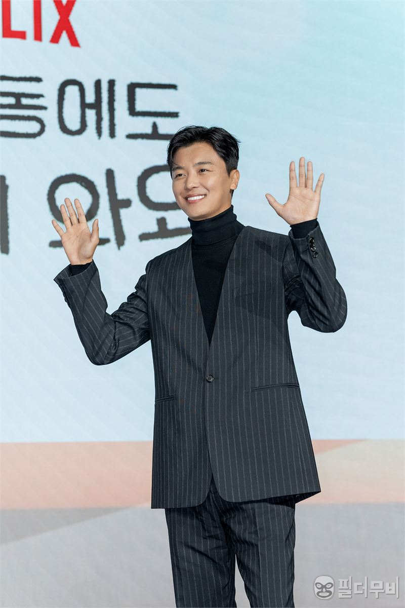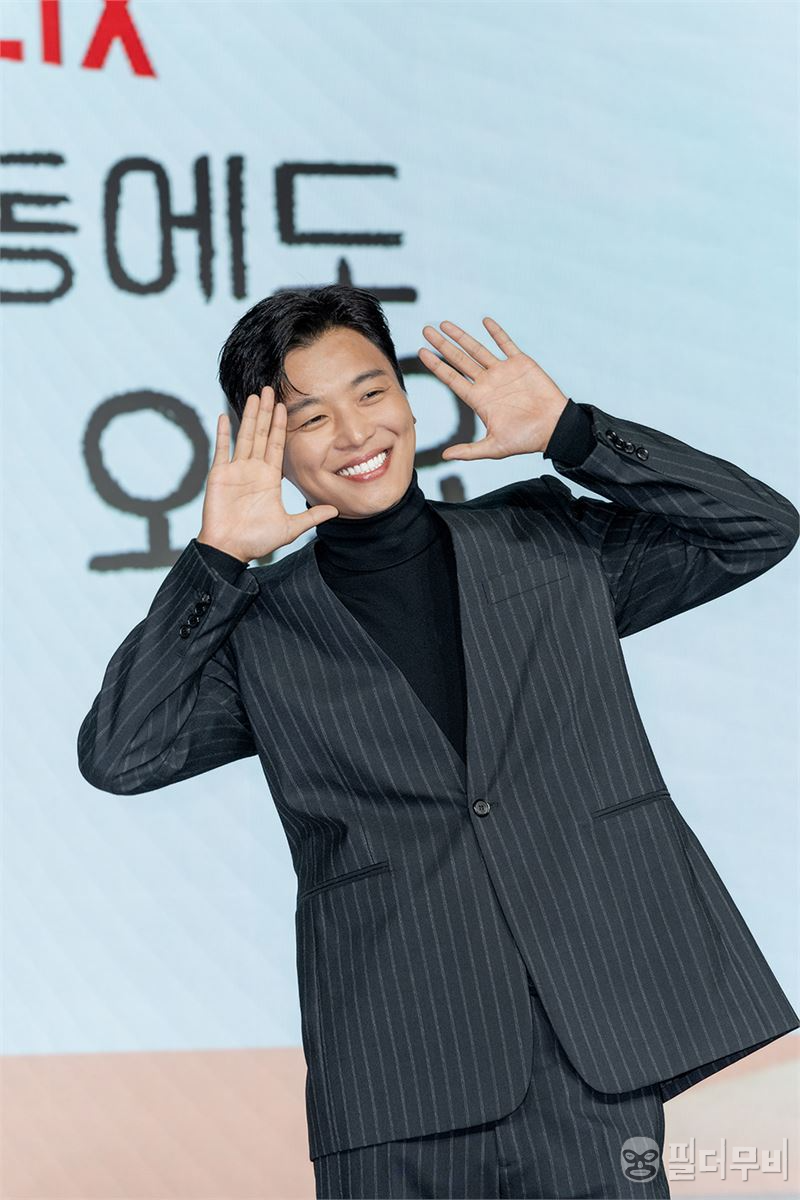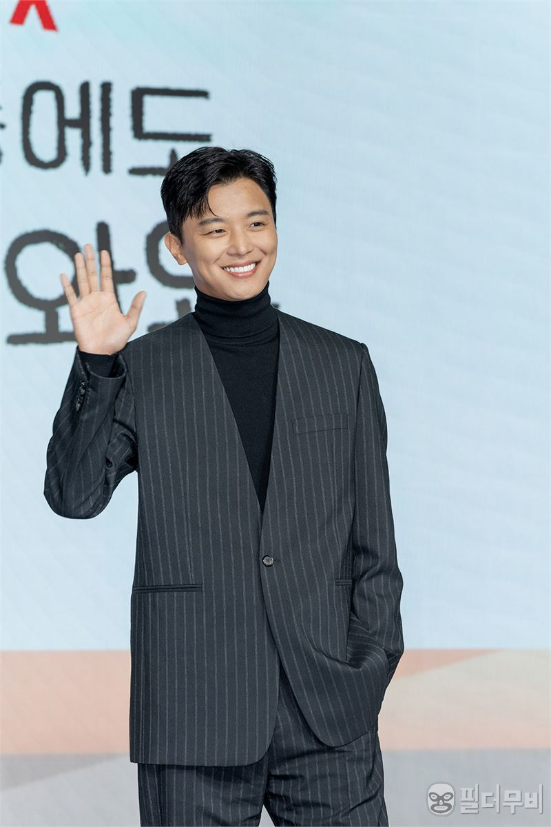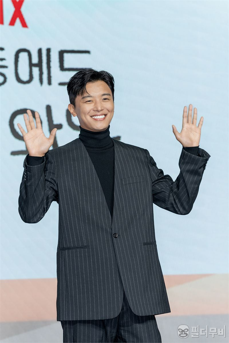 온화한 미소가 매려적인 배우 연우진이 넷플릭스 오리지널 시리즈 <정신병동에도 아침이 와요> 제작 보고회에 참석해 무대 인사를 하고 있다.