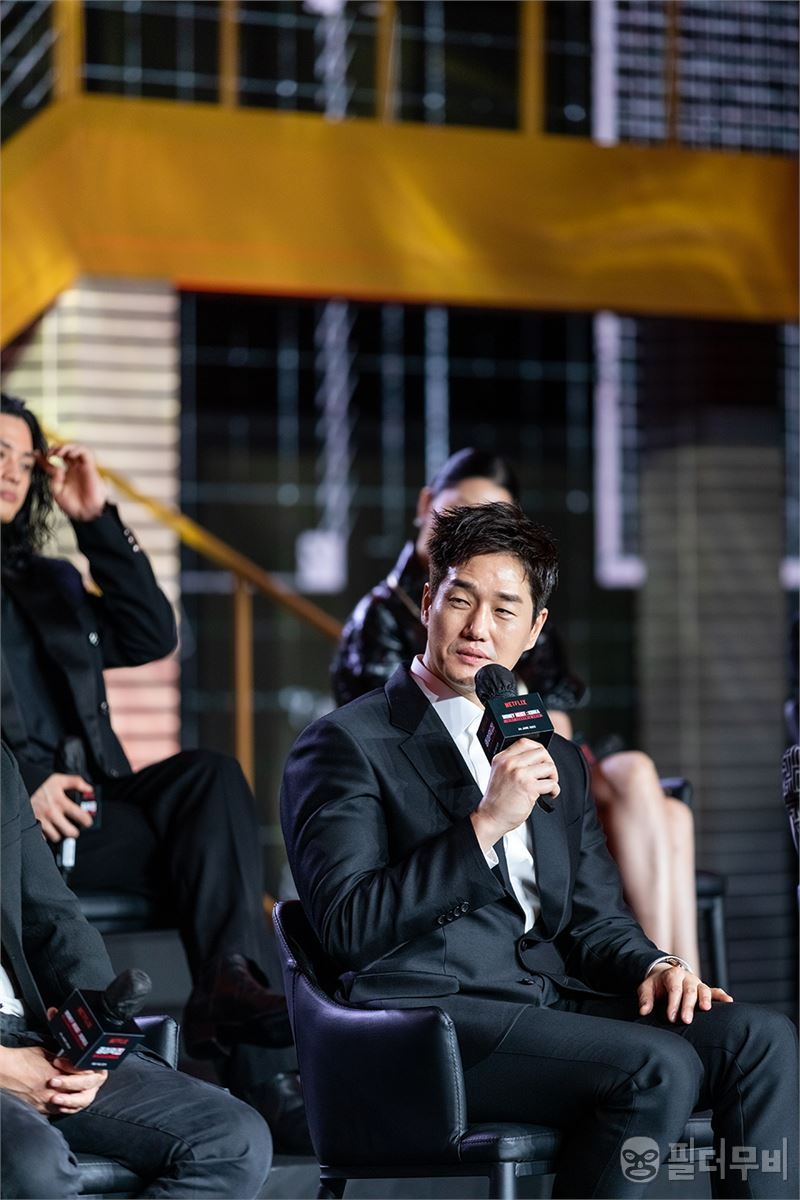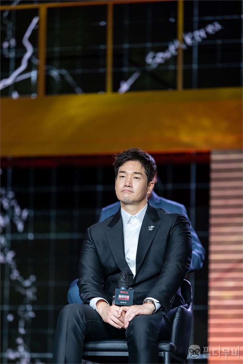 뛰어난 무대 매너와 진중한 모습으로 넷플릭스 오리지널 시리즈 <종이의 집: 공동경제구역> 제작발표회에 참석한 배우 유지태.