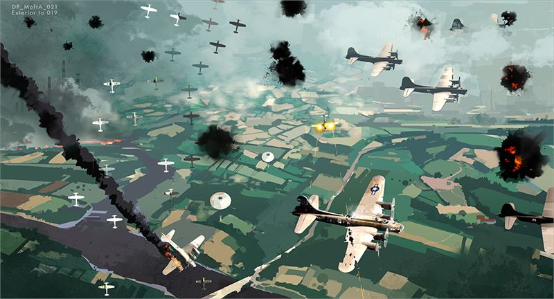-이러한 예산 관련 비하인드를 지닌 작품인 만큼 <마스터스 오브 디 에어>는 2차 세계대전 공중전 묘사 만큼은 역대급이라 할 수 있는 작품이다. 이 작품은 <탑건>,<미드웨이> 같은 전투기끼리 대결하는 작품이 아닌 지상에 폭탄을 떨어뜨려야 할 폭격기의 활약을 다룬다는 점에서 특별하다. 지금의 폭격기는 F-22로 대표되는 최첨단 전투기의 보호를 받으면서, 위성 시스템의 지원으로 높은 상공에서 엄청난 폭탄을 정확하게 떨어뜨리는게 특징이지만, 당시 폭격기의 상황은 지금과는 전혀 다른 정반대의 상황이었다.