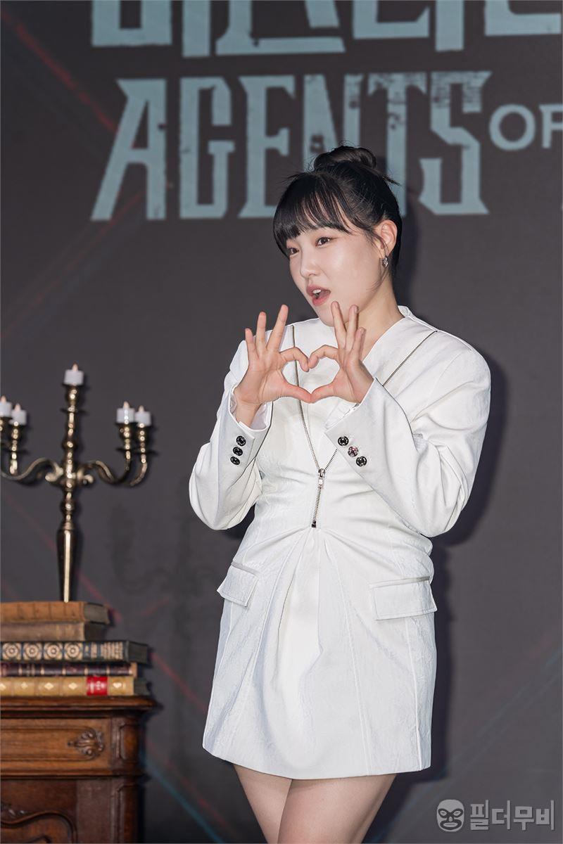 요즘 예능 대세 이은지가 깜찍한 포즈로 <미스터리 수사단> 제작보고회 무대인사를 하고 있다.