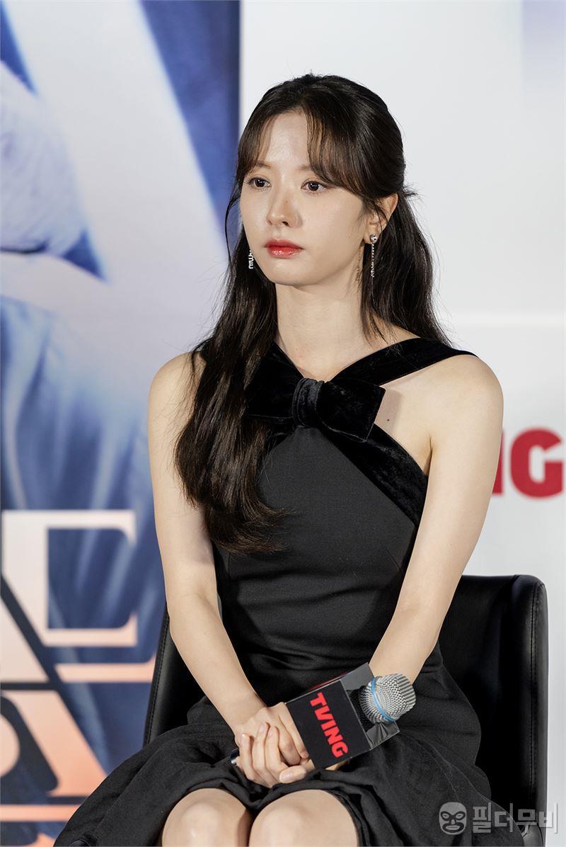 배우 김지연이 티빙 오리지널 <피라미드 게임> 제작보고회 무대에 오르고 있다.