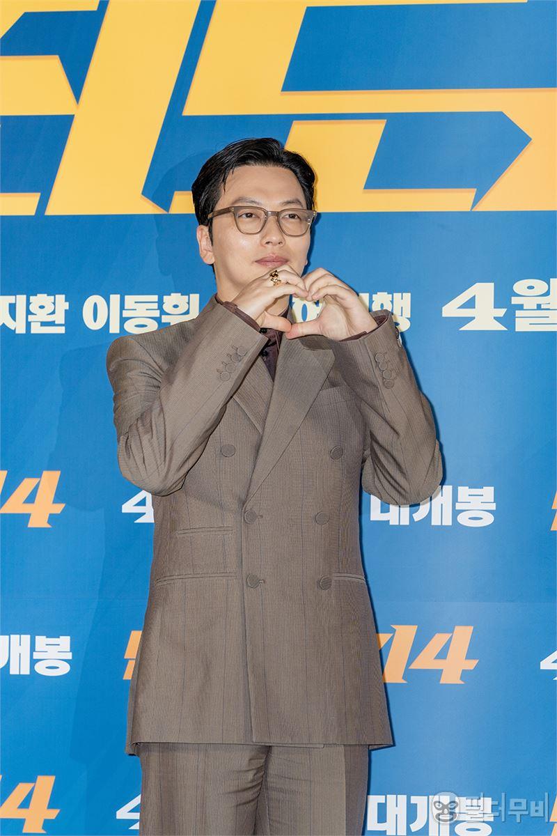배우 이동휘가 영화 <범죄도시 4> 제작보고회에서 귀여운 얼굴하트로 인사하는 배우 이동휘.