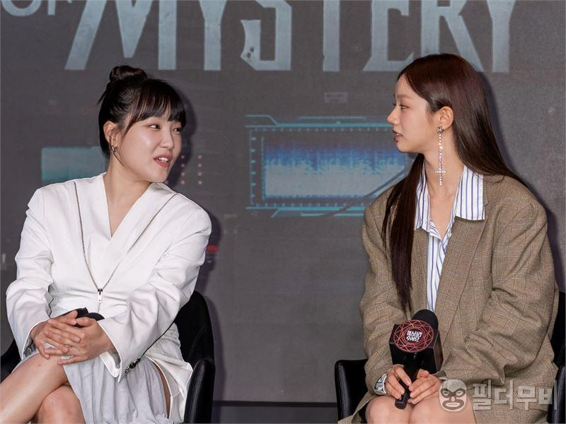 넷플릭스 추리예능 '미스터리 수사단' 제작보고회 무대에서 이야기를 나누는 혜리와 이은지.