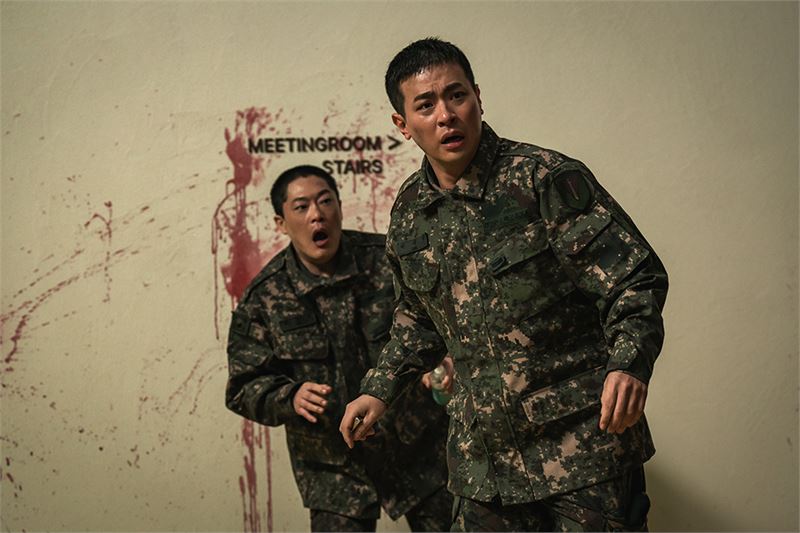 공개된 스틸에서 군 복무 중 좀비 사태와 맞닥뜨리는 재윤(박정민)은 숨 가쁜 모습과 경악하는 표정으로 이목을 집중시킨다. 그의 곁에서 유쾌한 케미를 보여줄 후임 인호(임성재)는 한층 더 놀란 모습을 보이며 위태로운 상황을 고스란히 전한다.