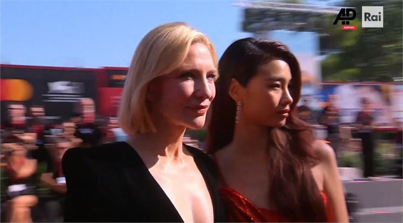 강렬하고 화려하게 빛나는 레드 드레스를 완벽하게 소화한 그는 쏟아지는 스포트라이트에 환한 미소로 응답해 시선을 집중시켰다. 특히 케이트 블란쳇과 화기애애한 투 샷은 극 중 두 사람의 호흡에 대한 기대감을 끌어올렸다.