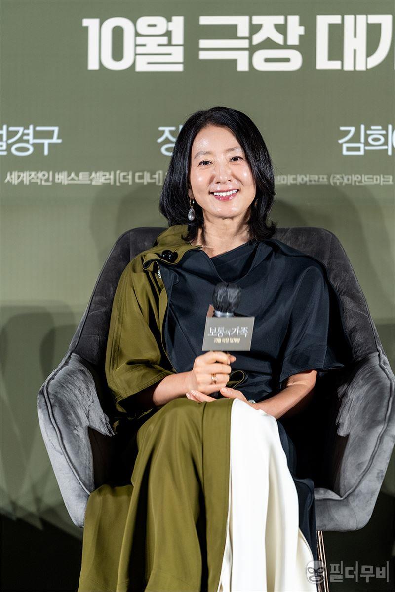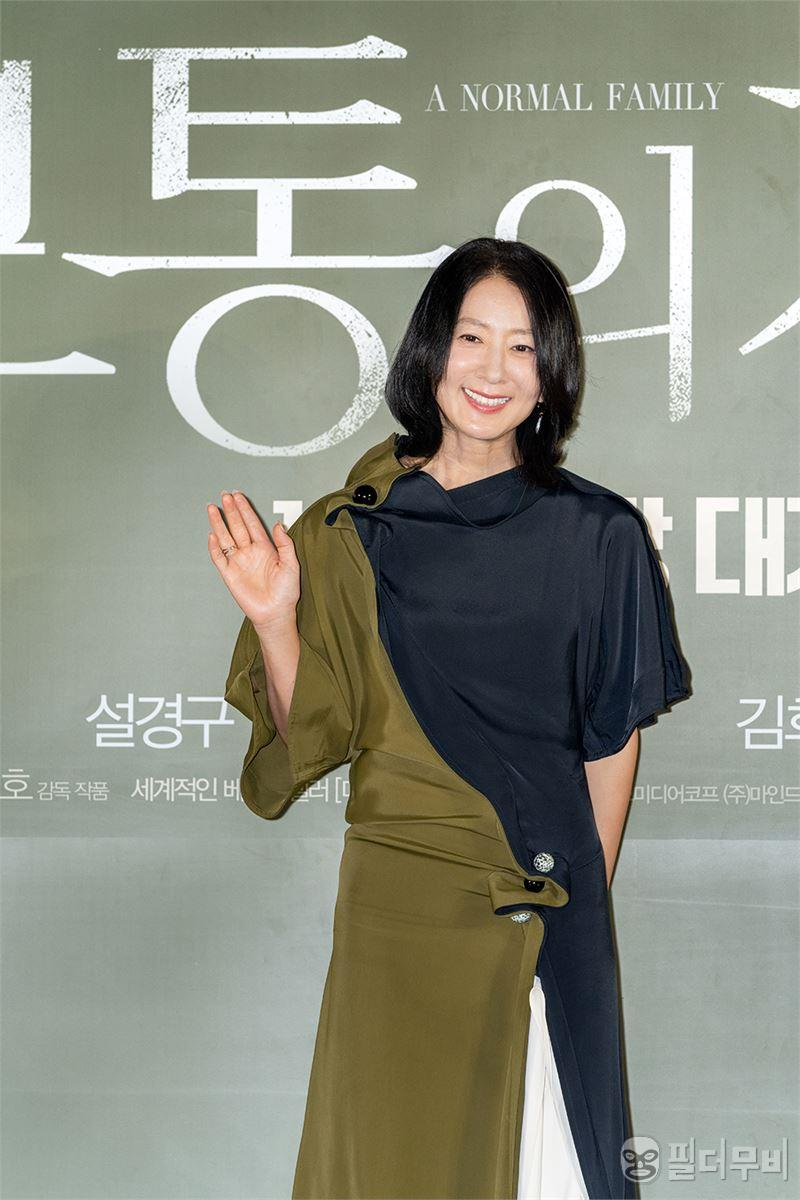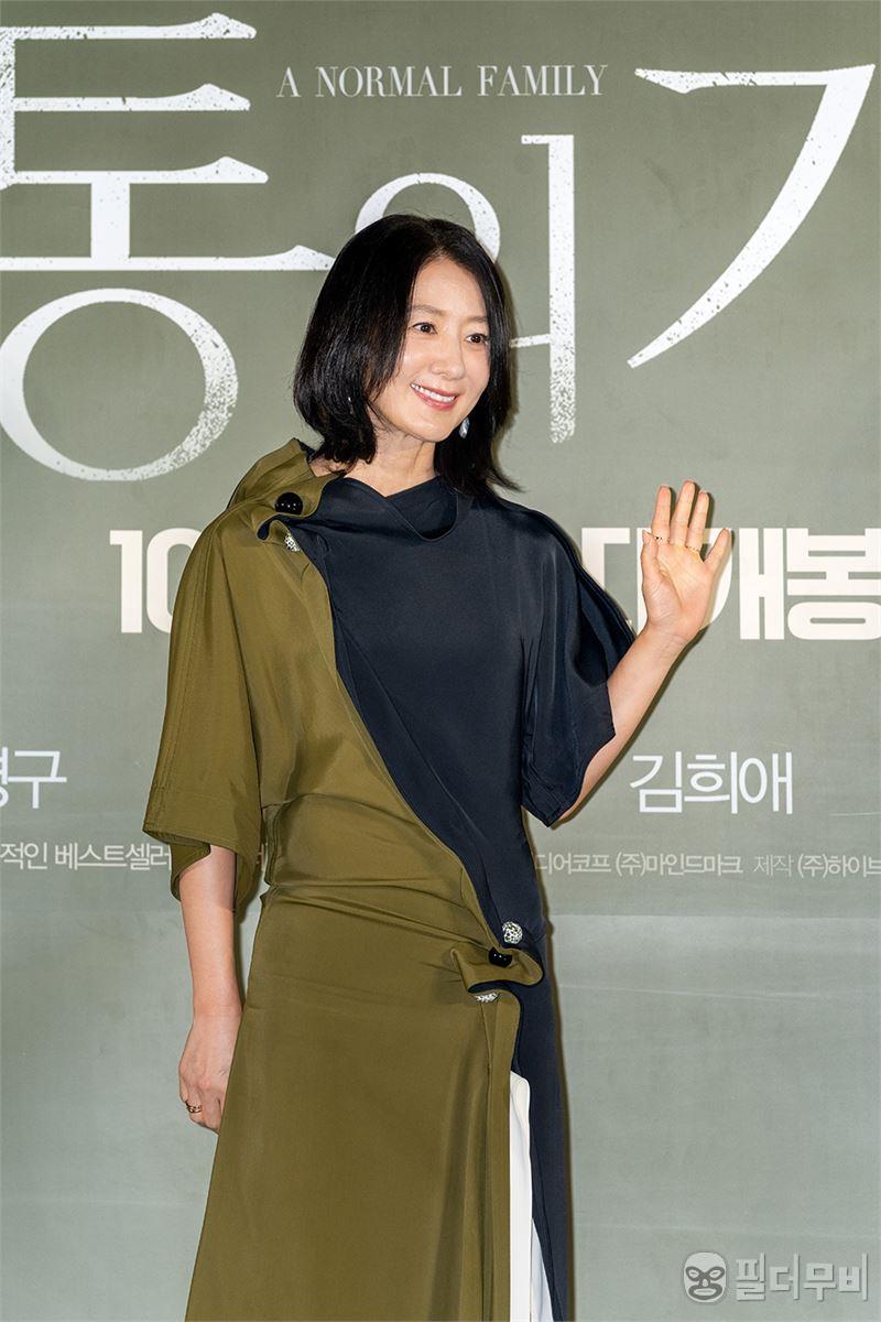 배우 김희애가 영화 '보통의 가족' 제작보고회 무대인사를 하고 있다.